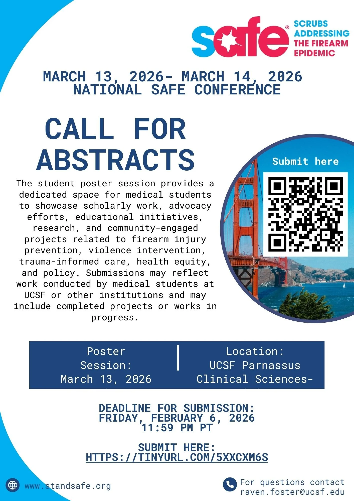 The UCSF SAFE Conference invites medical students to submit posters for the Medical Student Poster Session as part of the Firearm Injury Prevention and Care (FIPC) Curriculum Symposium, taking place March 13–14, 2026.
